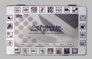 Samples are easy to find in the plastic partitioned box. Simply look at the interior diagram to find the correct product. Each image is clearly labeled with recommended surfaces, available sizes, colors and packaging choices. |